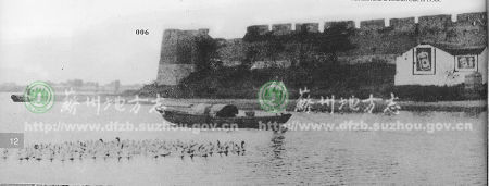 娄门城墙 娄门位于城东北。清初重建门楼后题以“江海扬华”额,城楼约在1948年拆除,1958年内城门和水门也被拆除。图为30年代娄门东北角城墙和护城河。