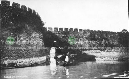 齐门水城门 齐门位于城北,因门朝向当时的齐国,故名。清初城楼题额“臣心拱北”。50年代初拆城门城楼,1978年建水闸时拆除水城门。图为30年代齐门水城门