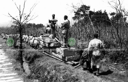 370藏书乡村民重建庙宇,运石上山。 30年代