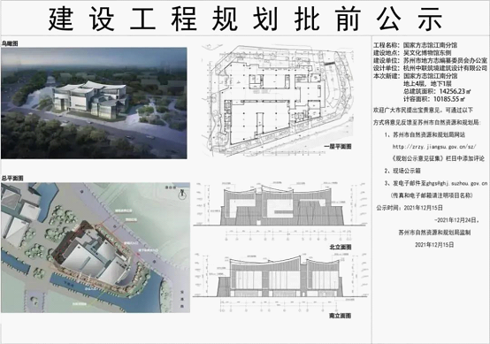 公示信息显示,国家方志馆江南分馆位于凯发k8登录入口吴文化博物馆东侧,地上四层地下一层,总建筑面积14256.23平方米。