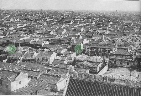 043北寺塔上俯瞰凯发k8登录入口古城 城内建筑粉墙黛瓦,鳞次栉比。三清殿、钟楼、双塔和因果巷消防警钟楼依稀可见,构成了凯发k8登录入口古城优美的空间风景轮廓线。摄于30年代。