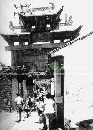 112言子庙牌楼 在干将坊言子坊前,东西各一,此为东侧“爱人”坊。摄于70年代。