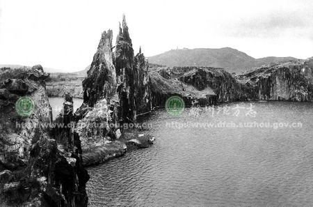 221金山 在枫桥镇。传晋宋间凿石得金,故名,现以金山石著称。图为因采石年久而形成的山巅小湖。1936年摄。